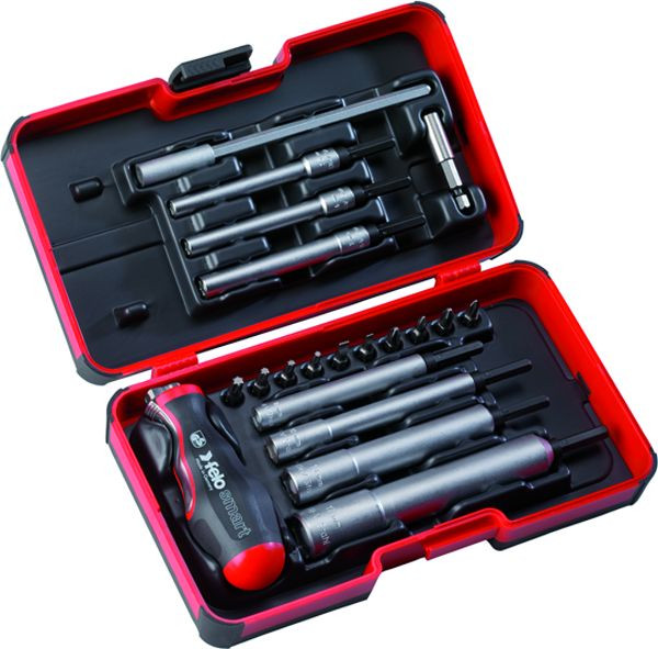 Smart-Engineer Wechselklingen-Schraubendrehersatz M-Tec 20-tlg., Mit 7 M-Tec Steckschlüsseln (5,5-17 mm) und 10 Bits in Industriequalität, 2 Bithaltern / Verlängerungen und Griff mit Schraubendreher- und T-Griff-Funktion, Smart Griff mit neu entwickeltem Klappmechanismus für Schraubendreher- und T-Griff-Funktion für optimalen Krafteinsatz, kein Umstecken der Klingen für den Funktionswechsel nötig, alle Teile 1/4" Normmaß - passend für Akkuschrauber M-Tec, Inhalt: 7x M-Tec Steckschlüssel, E 6,3 x 155, 5,5 / 6 / 7 / 8 / 10 / 13 / 17 mm, 1x Bithalter 1/4" x 155 mm, 1x Bithalter / Verlängerung, 1/4" x 58 mm, 10x Bits C 6,3 x 25 m, PH 1 / PH 2 / PZ 1 / PZ 2, 3,5 x 0,6 / 5,0 x 0,8, TX 15 / TX 20 / TX 25 / TX 30, 1x Smart-Griff 105 x 39 mm, Felo-Strongbox 130 x 56 x 30 mm