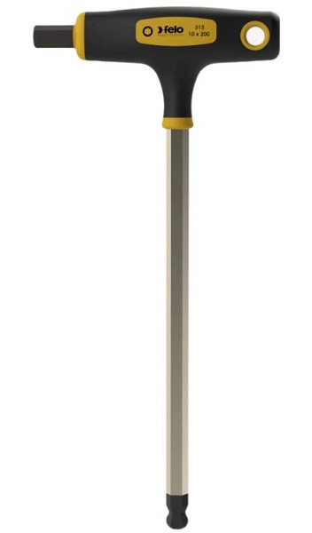 Felo 31510760 Dual Metric Hex T-Handle with Ball End, 10.0 mm x 200 mm Long end has a ball end for angled driving of hard-to-reach fasteners The handle end has a short driver for high-torque Hanging hole for easy storage Ergonomic, 2-component handle with soft-grip coating reduces pressure points Hard plastic core for durability, even at the highest torque Matte chrome plating with black tips Handle width: 100 mm Blade length: 200 mm Features: Ball End Finish: Satin Chrome Finish Handle Material: Multi-Component Material Individual / Set: Individual ToolsTip Style:Hex Tip Size: Hex Metric 10 mm