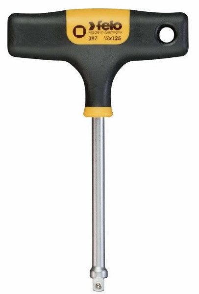 Felo 39763560 T-Griff mit Vierkantadapter 1/4" T-Griff 1/4" Vierkant-Steckschlüsseladapter (5" Klinge, 9" Gesamtlänge) Serie 397 - T-Griff mit Vierkantadapter Ergonomisch geformter, weicher Griff mit 2-Komponenten-Beschichtung Robuster , langlebiger Kern für höchste Drehmomente Aufhängeöse für einfache Aufbewahrung Klingen aus Chrom-Vanadium und Chrom-Molybdän-Vanadium Matt verchromte Klingen mit schwarzen Spitzen für präzise Passform GS-geprüft für Sicherheit Überragende Härte, die die DIN- und ISO-Anforderungen um bis zu 100 % übertrifft