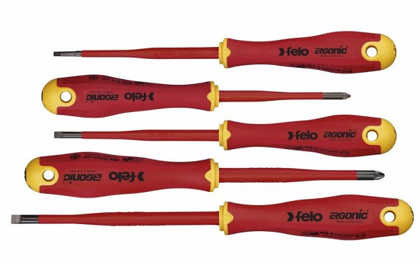 Felo 41385398 Satz dielektrischer Schraubendreher Ergonic E-SLIM SL/PZ, 5 Stück Die dielektrischen Schraubendreher der Felo E-Slim Serie sind für Elektroinstallationsarbeiten mit SL/PH-Schrauben in Anlagen und Schaltschränken mit Spannungen bis zu 1000 Volt konzipiert. Die E-Slim Serie unterscheidet sich von herkömmlichen Schraubendrehern durch ihren dünneren und längeren Griff (30 % dünner und 20 % länger) sowie die dünnere Stangenisolierung (50 % dünner). Dies gewährleistet einen sicheren Arbeitsabstand und bessere Sicht. Der glatte, nahtlose Griff mit weicher Außenbeschichtung bietet verbesserte Ergonomie dank der patentierten ERGONIC-Technologie von Felo - dem weltweit einzigen Griff, der sich der Hand des Benutzers anpasst und so für hervorragende Ergonomie, optimale Drehmomentübertragung und hohen Arbeitskomfort sorgt. Die Stange besteht aus hochwertigem Werkzeugstahl (CrMoV), ist zusätzlich ölgehärtet und verläuft über die gesamte Grifflänge. Alle Schraubendreher sind nach DIN EN 60900 zertifiziert, die eine Prüfung jedes einzelnen Werkzeugs mit 10.000 Volt vorschreibt. Setzusammensetzung: Schraubendreher SL 3,0x100 / 4,0x100 / 5,5x125; PZ 1x80 / ??PZ 2x100 Länge: 316 mm Breite: 150 mm Höhe: 40 mm Gewicht: 371 g Land: Deutschland Auswirkung: Nein Dielektrisch: Ja