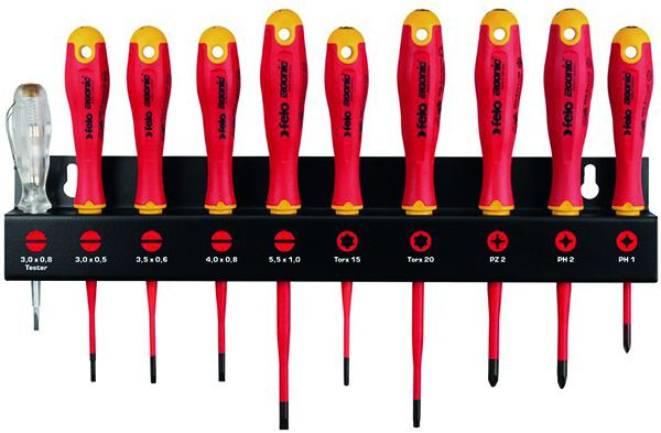Felo 41391093 Satz dielektrischer Schraubendreher SL/PH/PZ/Tx E-Slim Ergonic auf einem Stahlständer, 10 Stück Die dielektrischen Schraubendreher der Felo E-Slim Serie sind für Elektroinstallationsarbeiten mit SL/PH/PZ/Tx-Schrauben in Anlagen und Schaltschränken mit Spannungen bis zu 1000 Volt konzipiert. Die E-Slim Serie unterscheidet sich von herkömmlichen Schraubendrehern durch ihren dünneren und längeren Griff (30 % dünner und 20 % länger) sowie die dünnere Stangenisolierung (50 % dünner). Dies gewährleistet einen sicheren Arbeitsabstand und bessere Sicht. Der glatte, nahtlose Griff mit weicher Außenbeschichtung bietet verbesserte Ergonomie dank der patentierten ERGONIC-Technologie von Felo - dem weltweit einzigen Griff, der sich der Hand des Benutzers anpasst und so für hervorragende Ergonomie, optimale Drehmomentübertragung und hohen Arbeitskomfort sorgt. Die Stange besteht aus hochwertigem Werkzeugstahl (CrMoV), ist zusätzlich ölgehärtet und verläuft über die gesamte Grifflänge. Alle Schraubendreher sind nach DIN EN 60900 zertifiziert, die eine Prüfung jedes einzelnen Werkzeugs mit 10.000 Volt vorschreibt. Bühnenbild: Schraubendreher SL 3.0x100 / 3.5x100 / 4.0x100 / 5.5x125; PH1x80 / ????PH2x100; PZ2x100; Tx15/Tx20; Schraubendreher-Prüfgerät für Netzspannung 220-250 Volt. Länge: 414 mm Breite: 276 mm Höhe: 48 mm Gewicht: 1212 g Land: Deutschland