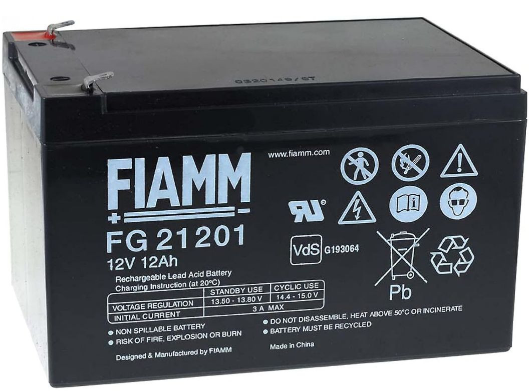 Bleiakku Fiamm FG21202 12 V 12Ah VdS-geprüft Dieser wartungsfreie Blei-Akkumulator zeichnet eine sehr geringe Selbstentladung und hohe Leistungsdichte aus. Zudem ist er als Gerätebatterie in vielen Anwendungen einsetzbar. Das robuste Gehäusematerial besteht aus einem schlag- und bruchfestem sowie korrosions- und alterungsbeständigem ABS-Kunststoff. Diese Blei-Akkus sind tiefenladesicher. Sie lassen sich nach einer Tiefentladung wieder aufladen. Akkus gleicher Kapazität können ohne Aufteilung der Ladung in Reihe und auch parallel geschaltet werden. Sie sollten unbedingt immer aus derselben Charge stammen.
