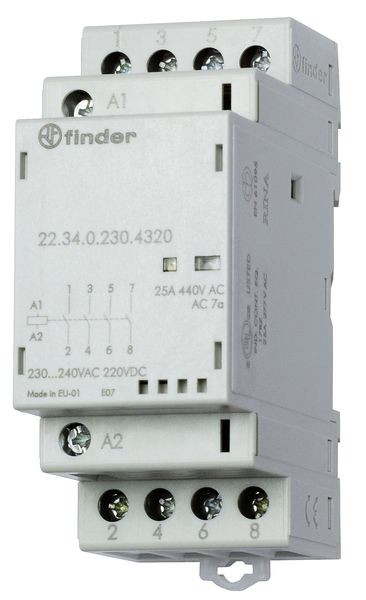 | Kurzbeschreibung | Schütz für Reiheneinbau, 4 Schließer 25 A, Spule 230 V AC/DC, LED-Anzeige |