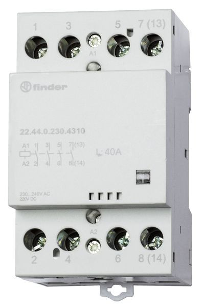 Installationsschütz für 35 mm-Schiene, 4 Schließer für 40 A / 440 V AC, Kontaktmaterial AgSnO2, max. Einschaltstrom 176 A - 5 ms, max. Schaltleistungen bei 230 V AC: AC1-AC-7a: 16 kVA, Bemessungsstrom AC3-AC7b 22 A, Glüh- und Halogenlampen 4000 W, Leuchtstofflampen mit EVG 1500 W, Leuchtstofflampen unkompensiert 1500 W, Energiesparlampen 1000 W, LED (230 V AC) 1000 W, NV-Halogenlampen oder LED mit EVG 1000 W, NV-Halogenlampen oder LED mit KVG 1500 W, Spule: 230 V AC/DC, Breite 53,5 mm, mechanische Schaltstellungsanzeige, Relaisschutzart: IP 20