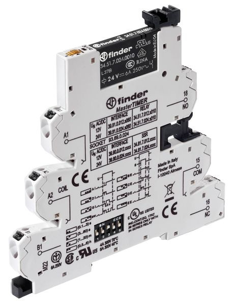 MasterTIMER schmales Zeitrelais für DIN-Schiene, mit Push-In-Klemmen, modular aufgebaut, 1 Wechsler für 6 A, Kontaktmaterial AgNi, 8 Zeitablauffunktionen: Ansprechverzögerung, Einschaltwischer, Impulsgeber 0,5 Sek, Symmetrischer Blinkgeber-impulsbeginnend, Rückfallverzögerung über Startkontakt, Ansprech-Rückfallverzögerung über Startkontakt, Einschaltwischer über Startkontakt, Ausschaltwischer über öffnenden Startkontakt, 4 Zeitbereiche bis 6 Std, LED-Anzeige, Klemmen A1 oder A2 und 15 sind brückbar, Ausgangssicherungsmodul Typ 093.63 für 5 x 20 mm Feinsicherungen anstelle des Blindstopfens einsetzbar, Spulenspannung 24 V AC/DC