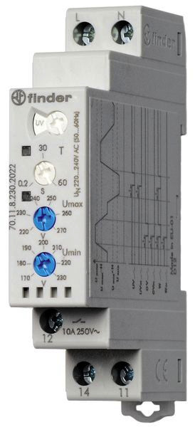 1-Phasen-Netzspannungsüberwachung 230 V AC 50/60 Hz, für DIN-Schiene, 1 Wechsler für 10 A (AC1), Kontaktmaterial AgNi, , Über- und Unterspannung, Messbereich 170-270 V AC, Spannungsfehler-Memory wählbar, farbige LED-Statusanzeige, 17,5 mm breit, für 230 V AC