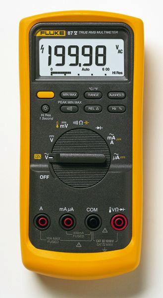 Das Fluke 87V Digitalmultimeter bietet Mess- und Fehlersuchfunktionen, ein großes Display mit analoger Balkenanzeige und zweistufiger heller Hintergrundbeleuchtung, einschaltbaren Filter für präzise Spannungs- und Frequenzmessungen an Motorantrieben, automatische und manuelle Bereichswahl, Touch Hold, akustische Durchgangsprüfung, Diodentest und Tastgrad und ein abnehmbares Holser einschließlich integrierter Halterung für Messleitungen und Messspitzen.