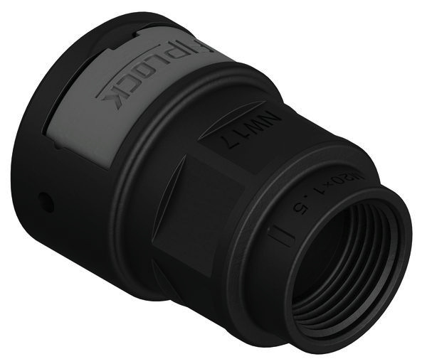 FIPLOCK®ONE Anschlussverschraubung Innengewinde AFPA-M aus speziell modifiziertem Polyamid 6, halogenfrei, UV-Beständig mit metrischen Kunststoffgewinde. Erfüllt die Schutzklassen IP66, IP67, IP68 und IP69. Das 360° Verriegelungssystems lässt sich mit Hilfe eines handelsüblichen Schlitz-Schraubendrehers einfach öffnen.