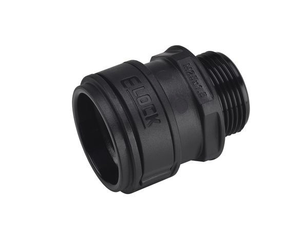 E-Lock ist eine Kunststoff-Verschraubung aus Polyamid 6, in Farbe schwarz, nicht flammenausbreitend, halogenfrei und UV-beständig.