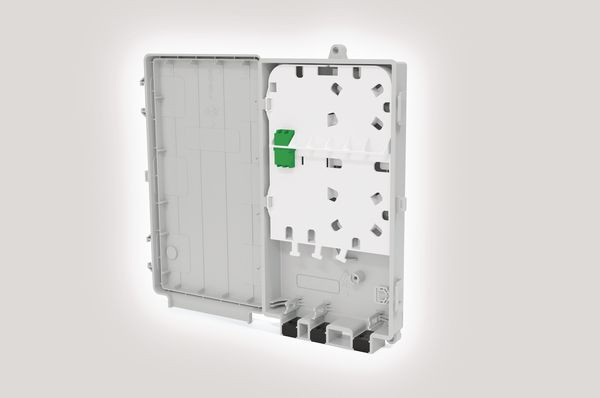 bis zu 2 Kundenanschlüsse 1 x LC/APC/DX. max. Spleißkapazität 12. mit integrierter Spleißkassette. mit Spleißschutzhalter Crimp, 3A. Überlängenspeicher integriert. Ein-/Ausgänge 6 x bis zu 8 mm oder 3 x bis zu 10 mm. Fasermanagementsystem mit Radiusbegrenzung 30 mm. Möglichkeit zur Montage von optischen Splittern. integrierte Ebenentrennung. verschiedene Kabeleinführungsmöglichkeiten (auch ungeschnitten). optionaler Überlängenspeicher. Schutzklasse IP54 und IK07. Brandklassenzertifizierung V0. Verschlussmöglichkeit plombierbar. Ideal für den Einsatz in der letzten Meile von FTTx-Netzen. Dieses Gehäuse ist speziell für die Installation im letzten Abschnitt der Glasfaserinfrastruktur (FTTx) konzipiert. Es eignet sich sowohl für Punkt-zu-Punkt- (P2P) als auch Punkt-zu-Mehrpunkt-Netzwerke (P2MP). Mit der Integration von PLC-Splittern – wahlweise vorkonfektioniert oder für geschnittene Kabel – sowie Pigtails und Adaptern lässt sich das Gehäuse flexibel an verschiedene Netzwerkanforderungen anpassen.