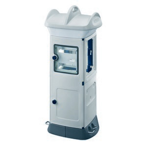 IEC Leergehaeuse 63B freistehend zum individuellen Ausbau als Steckdosenkombination fuer Campingplaetze, Jachthaefen, Festplaetze usw. Im oberen Bereich kann ein Beleuchtungsbausatz montiert werden. Der untere Bereich enthaelt einen Anschlussraum der mit Einspeiseklemmen bestueckt werden kann. Die Seitenwaende enthalten Vorpraegungen fuer 4 Wasser- oder Druckluftanschluesse 1/2". Verteilerraum hinter transparenter Tuer zur freien Bestueckung mit Reiheneinbaugeraeten. Der Verteilerraum kann durch ein Sicherheitsschloss nachgeruestet werden. 2 Seiten mit Vorpraegungen und Bohrungen zur Montage von 1 Flanschplatte fuer IEC Steckvorrichtungen usw. Das Gehaeuse kann direkt auf dem Boden oder mit einem Bodenbefestigungsflansch (Zubehoer) montiert werden. Gehaeuseschutzart IP56 (Die Schutzart wird durch die Verwendung der Steckdosen und Leitungseinfuehrungen bestimmt).