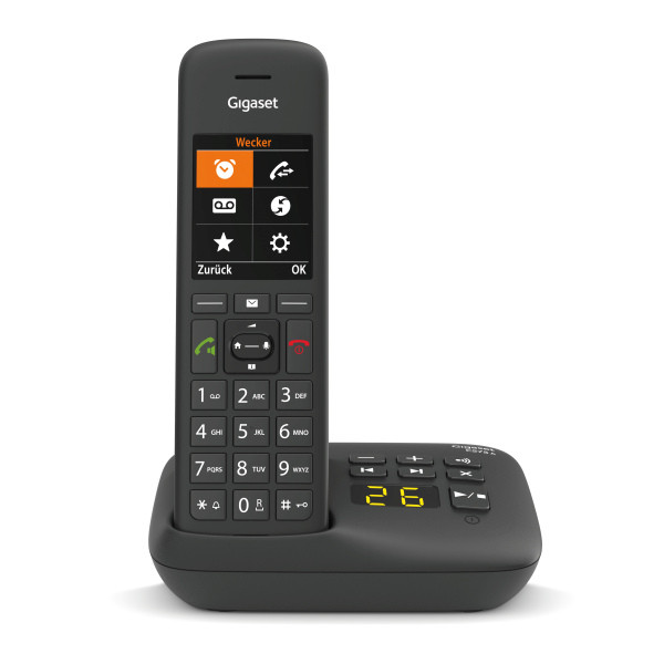 Integrierter digitaler Anrufbeantworter mit bis zu 30 Minuten Aufnahmezeit, Großes TFT Farbdisplay (58 mm / 2,2’’) mit moderner Benutzeroberfläche, Adressbuch für bis zu 200 Kontakte mit je 3 Telefonnummern, Sichere Bedienung durch große beleuchtete Einzel-Tasten am Mobilteil, Extra große Nummernanzeige im Display, Einfache Personalisierungsoptionen. Lieferumfang: 1 Gigaset C575A Basisstation, 1 Gigaset C575HX Mobilteil, 1 Steckernetzteil für Basisstation, 1 Telefonanschlusskabel, 2 AAA Akkus (NiMH), 1 Akkudeckel, 1 Bedienungsanleitung.