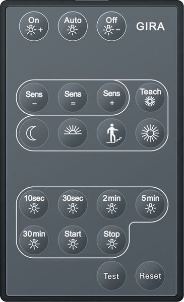- Infrarot-Fernbedienung zur manuellen Bedienung und Einstellung des Präsenzmelders Komfort für KNX.