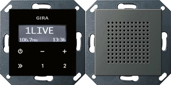 Unterputz-Radio RDS mit einem Lautsprecher Bedienaufsatz in Schwarzglasoptik Edelstahl Merkmale: - UKW-Radio mit RDS-Anzeige zur Unterputz-Montage. - Das Unterputz-Radio RDS besteht aus einem Einsatz Radio mit Bedienaufsatz und einem Einsatz Lautsprecher mit Abdeckung. - Der Einsatz Radio ist kompakt in einem Unterputz-Einsatz untergebracht und kann somit in eine einzelne Gerätedose installiert werden. - Der Lautsprecher kann mit dem Einsatz Radio in einer Kombination oder auch abgesetzt in eine Gerätedose installiert werden. An den Einsatz Radio können zwei Lautsprecher angeschlossen werden. - Das Radio erkennt angeschlossene Lautsprecher automatisch und schaltet zwischen Stereo- und Monobetrieb um. - Das Display des Bedienaufsatzes zeigt bei einem entsprechenden RDS-Signal den Sendernamen, die Sendefrequenz und die Uhrzeit an. - Die Bedienung des Radios erfolgt über die kapazitiven Tasten des Bedienaufsatzes. Zur Bedienung ist lediglich eine leichte Berührung der Symbole notwendig. - Das Unterputz-Radio RDS verfügt über zwei Speicherplätze, auf denen je ein Sender einfach per Tastenbetätigung gespeichert und abgerufen werden kann. - Über den Nebenstelleneingang kann das Radio z. B. mit einem Lichtschalter oder einem Automatikschalter zusammen mit der Raumbeleuchtung eingeschaltet werden. - Über den Stereo-AUX-Eingang des Radios können externe Audioquellen, z. B. MP3-Player, in das Radio eingespeist werden. Zum Anschluss der externen Audioquelle wird zusätzlich ein Einsatz Cinch-Audio benötigt, welcher an die AUX-Klemmen des Einsatzes Radio angeschlossen wird. - Der Einsatz Dockingstation wird zur Musikwiedergabe direkt an den Stereo-AUX-Eingang angeschlossen. - Im Sleep-Modus schaltet das Radio 30 Minuten nach dem Einschalten automatisch wieder aus. Hinweise : - In Kombination mit weiteren elektronischen Geräten unter einer gemeinsamen Abdeckung kann es zu Empfangsbeeinträchtigungen kommen.