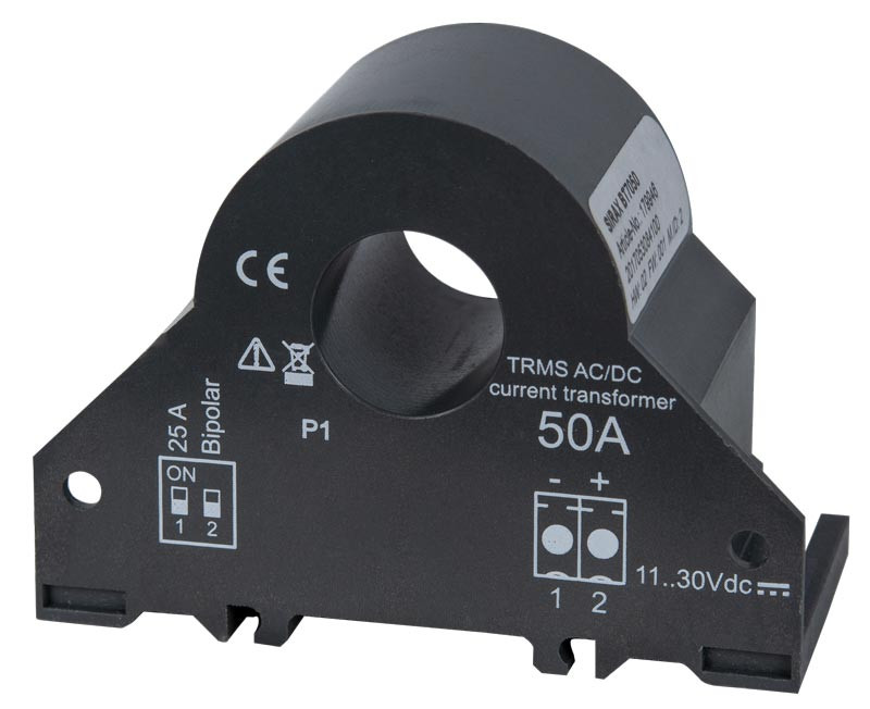 AC/DC Stromwandler mit Messumformer-Funktionalität: Nennstrom 50 A AC/DC. SIRAX BT7000/BT7050 Stromwandler mit integrierter Messumformer-Funktionalität zur Überwachung von 1-phasigen AC- oder DC-Anwendungen. Die Strommessung erfolgt galvanisch getrennt zur gemessenen Leitung. Die grosse Anzahl der gemessenen Variablen mit einem Maximalstrom von 50 A AC/DC ermöglichen einen vielseitigen Einsatz der Geräte.. Bruchfestes Kunststoffgehäuse aus PBT Schwer entflammbar und selbstverlöschend nach UL94 V0 Galvanische Trennung vom Messkreis Konfiguration mittels Konfigurationssoftware Serieller RS485 Modbus/RTU und analoger 0...10 V oder 4...20 mA Ausgang DIN-Schienen- oder Wandmontage für Vertikal- oder Horizontallage. Die AC/DC Stromwandler mit Messumformer-Funktionalität sind die ideale Lösung für Applikationen, bei denen nur der Strom überwacht werden muss. Die Geräte eignen sich perfekt zur Überwachung von mittleren/grossen Photovoltaik-Installationen, Batterieladesystemen und Industrieprozessen.. Grundgerät: Ohne Display, für Hutschienemontage Eingangsbereich: AC/DC 1P 50A Frequenzbereich: 20...200 Hz oder DC Messeingang Strom über Spannung: Ohne Hilfsenergie: 12…30 V DC Bus-Anschluss: - Standard Protokoll: - Ausgang: 4…20mA Messgrössen: Standard Prüfprotokoll: Ohne.