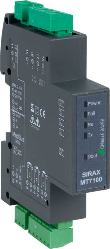 Dreiphasen-Netzmessgerät. Der SIRAX MT7100 / MT7150 ist ein "All in One" Dreiphasen-Netzmessgerät mit integriertem Energiezähler und universellen Stromeingang. Er ist für den Hutschieneneinbau konzipiert und es lassen sich gängige Strom- und Spannungswandler und Rogowski Spulen anschliessen. . Die Geräte messen RMS AC und DC, durchschnittliche min. und max. Werte, Frequenz, Crest Faktor, harmonische bis zur 63., THD, Ipeak und Upeak und viele mehr. Sie sind mit einem seriellen Ausgang RS485 Modbus RTU für Messwerte und einem digitalen Ausgang für Alarme ausgestattet. Über die kostenlose Konfigurationssoftware lassen sich die Geräte sehr einfach konfigurieren. Die Geräte dienen als ideale Lösung als Bindeglied der Mess-, Verarbeitungs- und Steuerebene. Sie eignen sich zur Überwachung von verschiedenen Messapplikationen in der Gebäudetechnik. . Bruchfestes Kunststoffgehäuse aus PBT Schwer entflammbar und selbstverlöschend nach UL94 V0 Gängige Strom- und Spannungswandler und Rogowski Spulen anschliessbar Konfiguration mittels Konfigurationssoftware Messgrössen: Energie & Leistungsgrössen Serieller RS485 Modbus/RTU Ausgang DIN-Hutschienenmontage für Vertikal- oder Horizontallage. Grundgerät: Ohne Display, für Hutschienemontage Eingangsbereich: AC 3P / 3PN Frequenzbereich: 40…70 Hz Messeingang Strom über Strom: 3 Stromwandlereingänge 5A/1A Messeingang Strom über Spannung: 0…333 mV Messeingang Spannung: 100...500 VL-L Hilfsenergie: 10…30VDC/19…28VAC Bus-Anschluss: RS485 (RTU) Standard Protokoll: Modbus Ausgang: Ohne Messgrössen: Standard Prüfprotokoll: Ohne.