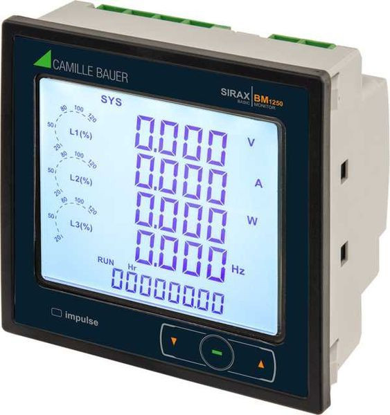 Multifunktionaler Messumformer und Leistungsüberwachungsgerät. Das multifunktionale Leistungs- und Überwachungsmessgerät SIRAX BM1250 ist für den festen Einbau und zur Messung der wichtigsten elektrischen Parametern in Niederspannungsanlagen geeignet. Die Messung ist für 1- oder 3-Phasen-Netzwerke mit 2-, 3- oder 4-Drahtanschlüssen ausgelegt und dienen zur sicheren Überwachung der elektrischen Verteilung.. Anwenderfreundlich Das Gerät lässt sich sehr einfach über 3 Drucktasten bedienen Mit seinem grossen, hintergrundbeleuchteten LCD-Display sind die Messdaten sehr gut lesbar Mit der Funktion "Benutzer zuweisbare Bildschirme" lassen sich 1 bis 10 Bildschirmanzeigen aus 28 Bildschirmen definieren Einfache, flexible und schnelle Montage dank Easy Clip oder Befestigungsbügel Multifunktional Vielzahl von Funktionen zur Messung von Spannung, Strom, Leistung, Energie und Qualität Verschiedene Relaisfunktionen integriert (Impulsausgang zur Energiemessung, Grenzwertausgang, Timerfunktion, RTC Relaisausgang) Eingebauter 8MB Flash Datenlogger (Eventlogging, Zeitlogging, Lastprofillogger) Vor-Ort-Konfiguration (Konfiguration über Drucktasten, USB-Interface oder über RS485/Modbus RTU möglich) Einfache Integration in übergeordnete Systeme durch offenen Kommunikationsweg über Modbus RTU Kommunikativ RS485-Schnittstelle mit Modbus/RTU Protokoll Sicher Passwort schützt gegen unbefugtes Verändern von Programmierungen und Konfigurationen Werkseitig ist kein Passwort vorgegeben. Anzeige und Kontrolle elektrischer Kennwerte in Energieverteilungsanlagen Interne Abrechnung / Überwachung und Rechnungsprüfung Submetering und Nebenkostenabrechnung Überwachung der elektrischen Last. Grundgerät Mit LCD Display Schalttafeleinbau 96x96 Netz AC 3P / 3PN Frequenzbereich 45-65 Hz Messeingang Strom 3 Stromwandlereingänge 5A/1A Messeingang Spannung AC 100…600 VL-L Messeingang Spannung DC Ohne Hilfsenergie 12…60 V AC/DC Bus-Anschluss Ethernet Standard- Protokoll Modbus Datalogger Ohne Ausgang Ohne Prüfprotokoll Englisch.