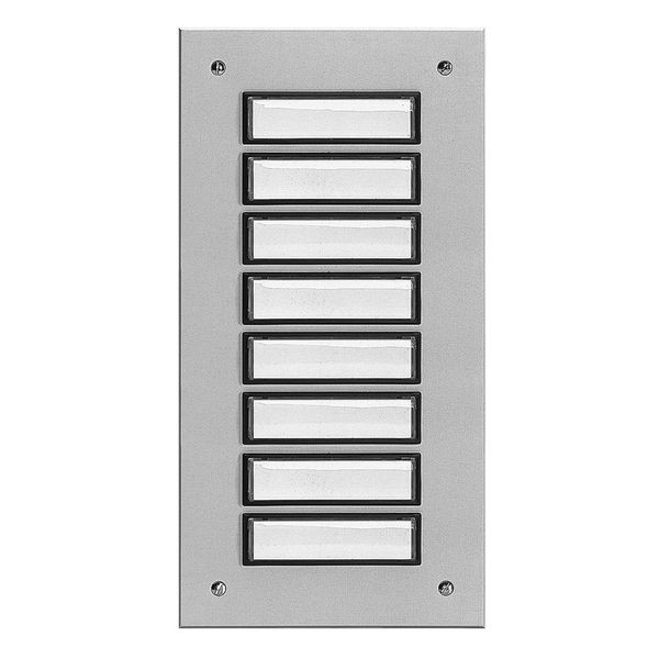 Aluminium, silber eloxiert, Unterputz-Montage, beleuchtbar, Anzahl Flächentaster siehe Bestellübersicht, incl. 1 Licht-Schild (rot), witterungsbeständig, Befestigungsbohrungen: jeweils 16 mm von Außenkante