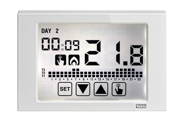 5,2" Touch-Display mit weißer Hintergrundbeleuchtung. Das digitale Raumthermostat ist geeignet für Fußbodenheizung, Heizkörper mit elektrischer Regelung und Klimaanlagen.