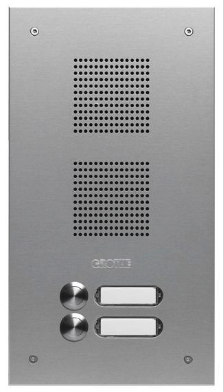Die Serie ROBUSTA ist ausgestattet mit Eigenentwicklungen aus unserem Hause, wie z. B. den Tastern der Serie PROTACT oder dem LED-Namensschild. Bei diesem Artikel handelt es sich um eine bündig abschließende Unterputz-, Audio-Türstation mit insgesamt zwei Klingeltastern und zwei Namensschildern. Der PROTACT Klingeltaster mit seiner taktilen Rückmeldung gibt Ihnen ein angenehmes Gefühl beim Betätigen und das Namensschild rundet visuell nochmals mit seiner LED-Beleuchtung die Front ab. Die 2,5 mm dicke Frontplatte ist aus Aluminium (Silber eloxiert), was der Türstation einen edlen Look verschafft. Neben dem verzinktem Unterputzkasten und den diebstahlsicheren Befestigungsschrauben, besitzt die ROBUSTA einen integrierten Lautsprecheradapter und bietet Ihnen zusätzlich so die Möglichkeit einen GROTHE Lautsprecher einzubauen. Der patentierte Lautsprecheradapter bieten mit den getrennten Kammern sowie dem Wasserableitsystem eine optimale Akustik und den besten Schutz gegen Witterungseinflüsse.