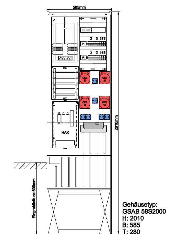| Kurzbeschreibung | Festplatzsäule mit VNB-Teil, bestückt mit 2xCEE32+2xCEE16+6xSchuko, mit FP-Einf |