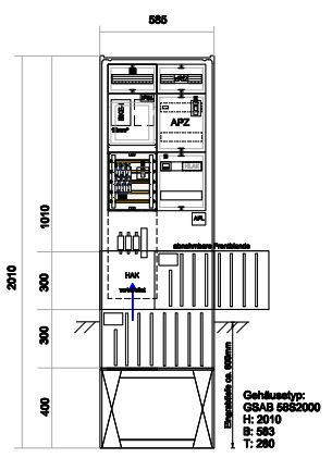 GSAB-Säulenprogramm – Zähleranschlusssäule mit APZ und RfZ für steuerbare Verbraucher. Gehäuse mit Eingrabsockel aus heißgepresstem, hochschlagfestem, wärmebeständigem, selbstverlöschendem, halogenfreiem, verrottungsfestem, glasfaserverstärktem Polyester (SMC), beständig gegen chemische Einwirkungen, durchgefärbt ähnlich RAL 7035 grau. Gehäuse und Sockel bilden eine Einheit. Der Sockelfuß ist als Platte ausgebildet und sorgt damit für sofortige Standsicherheit beim Aufstellen im Kabelgraben. Zwei durchlaufende Befestigungsleisten mit 210 Befestigungspunkten bis in den Sockelbereich ermöglichen die individuelle Befestigung von Geräten, einer Kabelabfangschiene sowie der Montageplatte. Ausgestattet mit einer Tür, 3-Punkt-Stangenschloss mit Doppelschließanlage. Ein Profilzylinder ist eingebaut sowie ein Platz für den Profilzylinder des Netzbetreibers vorgesehen. Das waagerecht eingebaute Schließsystem ermöglicht einen werkzeuglosen Türanschlagwechsel. Bei Doppelschließsystem erfolgt die Verriegelung mit einem Profilzylinder unabhängig vom zweiten. Eine Wetterschutzabdeckung der Profilzylinder aus besonders verstärktem Zinkdruckguss verhindert Vandalismusschäden. Material: glasfaserverstärktes Polyester (SMC) nach IEC-695-2-1, halogenfrei. Maße: Höhe 2010 mm mit Sockel (Eingrabtiefe ca. 600 mm), Breite 585 mm, Tiefe 280 mm. Schutzart: IP44. Ausführung gemäß TAB (oder TAB-gleiche Stadtwerke) für Zähler ohne TSG-Feld. Bestückt mit: Hausanschlusskasten 3x NH00 oder vorbereitet für HAK, Sammelschienensystem 250A (nAR), vorbereitet zum Einbau von SH-Schaltern, Spannungsversorgung B10/25kA 1pol (plombierbar) für RfZ auf Buchsenstecker, 4-Leiter-Verdrahtung (TT-Netz) mit H07V-K 16mm², Zählerfelder für Dreipunktbefestigung 450x250 mm, 1x RfZ-Feld 150x250 mm unbestückt, 1x APZ-Feld 300x250 mm (plombierbar) inkl. Spannungsversorgung, anlagenseitiger Anschlussraum (aAR) 300x250 mm, Hauptschalter 63A , HLAK 25mm². Bezugsquelle: www.gsab.de, E-Mail: vertrieb@gsab.de, Tel: 03636-76140. Separat zu bestellen: Sockelfüllmaterial (Blähtonkugeln), Gitterbodenplatte mit Erdungsschraube (nur erforderlich bei Nutzung für Erdung), siehe Zubehörliste.