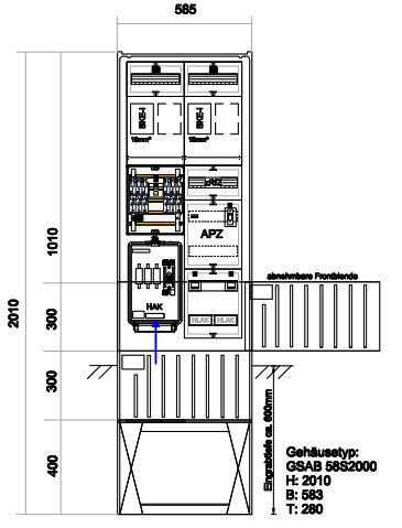 GSAB-Säulenprogramm – Zähleranschlusssäule mit APZ und RfZ für steuerbare Verbraucher. Gehäuse mit Eingrabsockel aus heißgepresstem, hochschlagfestem, wärmebeständigem, selbstverlöschendem, halogenfreiem, verrottungsfestem, glasfaserverstärktem Polyester (SMC), beständig gegen chemische Einwirkungen, durchgefärbt ähnlich RAL 7035 grau. Gehäuse und Sockel bilden eine Einheit. Der Sockelfuß ist als Platte ausgebildet und sorgt damit für sofortige Standsicherheit beim Aufstellen im Kabelgraben. Zwei durchlaufende Befestigungsleisten mit 210 Befestigungspunkten bis in den Sockelbereich ermöglichen die individuelle Befestigung von Geräten, einer Kabelabfangschiene sowie der Montageplatte. Ausgestattet mit einer Tür, 3-Punkt-Stangenschloss mit Doppelschließanlage. Ein Profilzylinder ist eingebaut sowie ein Platz für den Profilzylinder des Netzbetreibers vorgesehen. Das waagerecht eingebaute Schließsystem ermöglicht einen werkzeuglosen Türanschlagwechsel. Bei Doppelschließsystem erfolgt die Verriegelung mit einem Profilzylinder unabhängig vom zweiten. Eine Wetterschutzabdeckung der Profilzylinder aus besonders verstärktem Zinkdruckguss verhindert Vandalismusschäden. Material: glasfaserverstärktes Polyester (SMC) nach IEC-695-2-1, halogenfrei. Maße: Höhe 2010 mm mit Sockel (Eingrabtiefe ca. 600 mm), Breite 585 mm, Tiefe 280 mm. Schutzart: IP44. Ausführung gemäß TAB (oder TAB-gleiche Stadtwerke) für Zähler ohne TSG-Feld. Bestückt mit: Hausanschlusskasten 3x NH00 oder vorbereitet für HAK, Sammelschienensystem 250A (nAR), vorbereitet zum Einbau von SH-Schaltern, Spannungsversorgung B10/25kA 1pol (plombierbar) für RfZ auf Buchsenstecker, 4-Leiter-Verdrahtung (TT-Netz) mit H07V-K 16mm², Zählerfelder für Dreipunktbefestigung 450x250 mm, 1x RfZ-Feld 150x250 mm unbestückt, 1x APZ-Feld 300x250 mm (plombierbar) inkl. Spannungsversorgung, anlagenseitiger Anschlussraum (aAR) 300x250 mm, Hauptschalter 63A , HLAK 25mm². Bezugsquelle: www.gsab.de, E-Mail: vertrieb@gsab.de, Tel: 03636-76140. Separat zu bestellen: Sockelfüllmaterial (Blähtonkugeln), Gitterbodenplatte mit Erdungsschraube (nur erforderlich bei Nutzung für Erdung), siehe Zubehörliste.