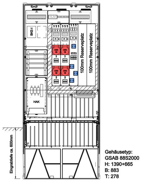 | Kurzbeschreibung | Zählersäule Netze BW 1ehz-Zähler, Festplatzteil Systemleisten CEE32+CEE16+Schuko, 2xReservepl. |