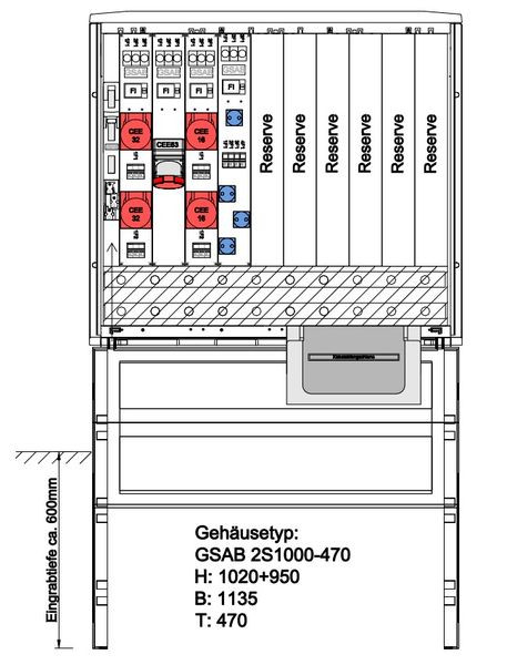 | Kurzbeschreibung | Festplatzverteiler HxBxT:1000x1135x470 Sammelschiene 400A, 5-pol,.LSL00-Sy63-32-16+Schuko |