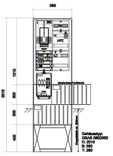 GSAB-Säulenprogramm – Zähleranschlusssäule mit APZ und RfZ für steuerbare Verbraucher. Gehäuse mit Eingrabsockel aus heißgepresstem, hochschlagfestem, wärmebeständigem, selbstverlöschendem, halogenfreiem, verrottungsfestem, glasfaserverstärktem Polyester (SMC), beständig gegen chemische Einwirkungen, durchgefärbt ähnlich RAL 7035 grau. Gehäuse und Sockel bilden eine Einheit. Der Sockelfuß ist als Platte ausgebildet und sorgt damit für sofortige Standsicherheit beim Aufstellen im Kabelgraben. Zwei durchlaufende Befestigungsleisten mit 210 Befestigungspunkten bis in den Sockelbereich ermöglichen die individuelle Befestigung von Geräten, einer Kabelabfangschiene sowie der Montageplatte. Ausgestattet mit einer Tür, 3-Punkt-Stangenschloss mit Doppelschließanlage. Ein Profilzylinder ist eingebaut sowie ein Platz für den Profilzylinder des Netzbetreibers vorgesehen. Das waagerecht eingebaute Schließsystem ermöglicht einen werkzeuglosen Türanschlagwechsel. Bei Doppelschließsystem erfolgt die Verriegelung mit einem Profilzylinder unabhängig vom zweiten. Eine Wetterschutzabdeckung der Profilzylinder aus besonders verstärktem Zinkdruckguss verhindert Vandalismusschäden. Material: glasfaserverstärktes Polyester (SMC) nach IEC-695-2-1, halogenfrei. Maße: Höhe 2010 mm mit Sockel (Eingrabtiefe ca. 600 mm), Breite 585 mm, Tiefe 280 mm. Schutzart: IP44. Ausführung gemäß TAB (oder TAB-gleiche Stadtwerke) für Zähler ohne TSG-Feld. Bestückt mit: Hausanschlusskasten 3x NH00 oder vorbereitet für HAK, Sammelschienensystem 250A (nAR), vorbereitet zum Einbau von SH-Schaltern, Spannungsversorgung B10/25kA 1pol (plombierbar) für RfZ auf Buchsenstecker, 4-Leiter-Verdrahtung (TT-Netz) mit H07V-K 16mm², Zählerfelder für Dreipunktbefestigung 450x250 mm, 1x RfZ-Feld 150x250 mm unbestückt, 1x APZ-Feld 300x250 mm (plombierbar) inkl. Spannungsversorgung, anlagenseitiger Anschlussraum (aAR) 300x250 mm, Hauptschalter 63A , HLAK 25mm². Bezugsquelle: www.gsab.de, E-Mail: vertrieb@gsab.de, Tel: 03636-76140. Separat zu bestellen: Sockelfüllmaterial (Blähtonkugeln), Gitterbodenplatte mit Erdungsschraube (nur erforderlich bei Nutzung für Erdung), siehe Zubehörliste.