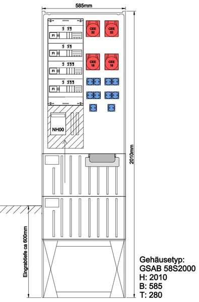 | Kurzbeschreibung | Festplatzverteiler mit Sockel HxBxT:2010x350x280 mit NH00,2xCEE32,2xCEE16,10xSchuko inkl. FP-Einf. |