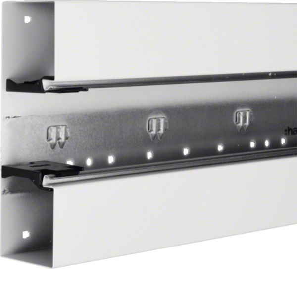 Das Brüstungskanal-Unterteil aus Stahlblech, passend für Oberteile mit 120 Millimeter Breite, ermöglicht durch seine Bodenlochung eine direkte Wandmontage. Es unterstützt den werkzeuglosen Geräteeinbau mittels frontrastender Clip-Technik. Zusätzlich bietet es Rechtecklochungen zur Befestigung auf Konsolen, was eine schnelle und präzise Installation fördert. Verfügbar im Zubehör sind auch Kupplungen für Potenzialausgleich und passende Trennwände.
