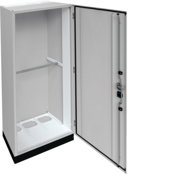 Einzelstandverteiler für Innenraum, Maße: 1850x800x400mm + 100mm Sockel. Konform mit DIN EN 61439-1/-2/-3, DIN 43 870. Geeignet für Niederspannungsverteilung bis 800 Ampere, 3AC 230/400 Volt 50 Hertz. Schutzart IP Standard 55, wählbare Schutzklasse I. Gehäuse aus 1,5 mm dickem, pulverbeschichtetem Stahl mit durchgehender Türdichtung, temperatur- und ölbeständig. Inklusive Sockelleiste und Schwenkhebelverschluss, DIN-Profil-Halbzylinder nachrüstbar.