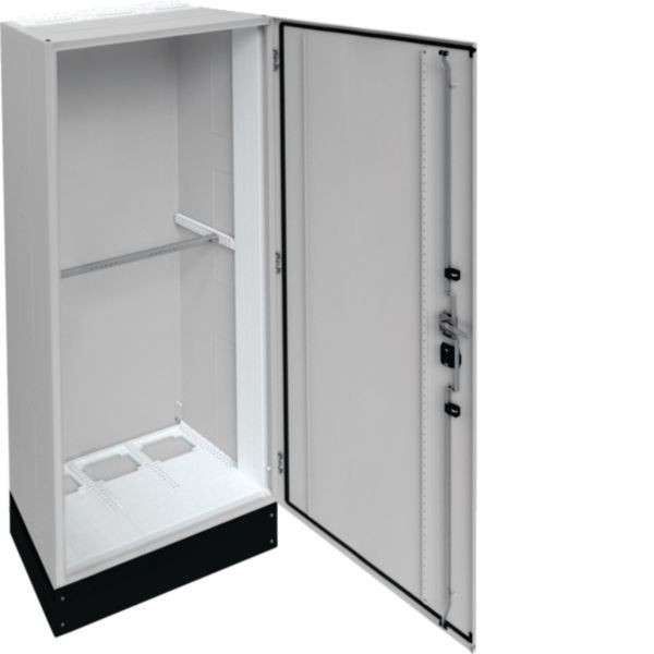 Einzelstandverteiler, 1850x800x400mm + 200mm Sockel, zur Aufputzmontage, konform mit DIN EN 61439-1/-2/-3 und DIN 43 870. Für Niederspannungsverteilung bis 800 Ampere, 3AC 230/400 Volt, 50 Hertz. IP Standard 55, Schutzklasse I, Luft- und Kriechstrecken nach DIN VDE 0110-1/-2. Gehäuse aus 1,5 mm dickem Stahlblech, pulverbeschichtet. Tür mit Schwenkhebelverschluss, 110 Grad Öffnungswinkel, Sockelleiste mit abnehmbarer Front.