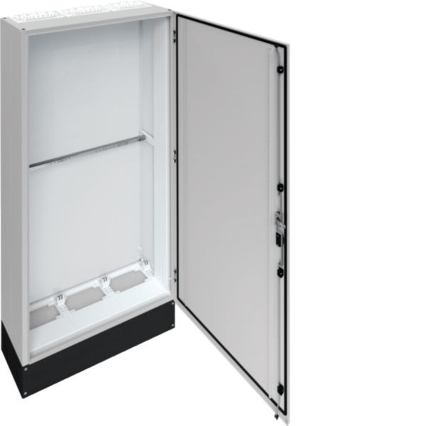 Einzelstandverteiler für Innenräume, 1850x800x275mm, Sockel 200mm. Konform mit DIN EN 61439 und DIN 43 870. Für Niederspannungsverteilung bis 800 Ampere, 3AC 230/400 Volt, 50 Hertz. Schutzart IP Standard 55, Schutzklasse II. Gehäuse aus 1,5 mm Stahlblech, pulverbeschichtet. Features: durchgehende Türdichtung, Öffnungswinkel 110 Grad, Schwenkhebelverschluss, Sammelschienenvorprägungen, verstellbarer Türanschlag.