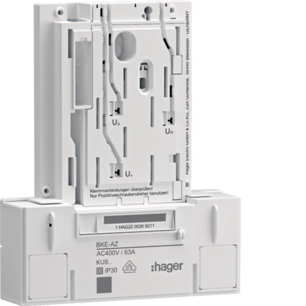 BKE-A, 3-phasige Befestigungs- und Kontaktiereinrichtung für elektronische Haushaltszähler (eHZ), VDE-zertifiziert nach DIN VDE 0603-3-2. Für Kupferleiter 4-25 mm², starr/feindrähtig. Bemessungsstrom 63 Ampere, Dauerbetriebsstrom 32/44/50 Ampere. Einbaumaße: 179 mm Breite, 221 mm Höhe, 107 mm Tiefe. Zusatzklemmen für Spannungsabgriffe und Sicherung durch Steckschloss.