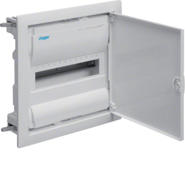 Kleinverteiler volta HWV mit 1x12 Platzeinheiten und IP30 Schutzart für die Hohlwandmontage. Konform mit DIN VDE 60670-24 und DIN 43871 für Geräteeinbau bis 63A und 70 mm Tiefe nach DIN 43880. Bemessungsspannung 400 V AC. Schutzklasse II, schutzisoliert, mit Kunststoff-Mauerkasten inkl. Leitungsabfang und ausbrechbaren Einführungsschiebern. Hohlwandbefestigung über Schnellfixierungshebel, Geräteträger aus verzinktem Stahlblech, Blendrahmen und Tür aus pulverbeschichtetem Stahlblech.