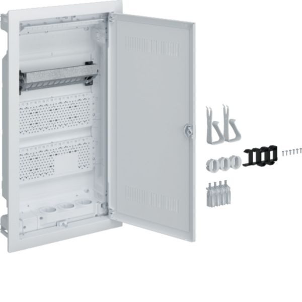 Installationskleinverteiler Hohlwand, 3-reihig, IP Standard 30, Schutzklasse II. Geeignet für VDI-Komponenten, DIN VDE 61439-3 konform. Ausstattung: Kunststoff-Mauerkasten mit Leitungsabfang, Wasserwaage, Schnellfixierungshebel. Lüftungstür aus Stahlblech mit Kunststoffeinsatz, Blendrahmen verdrehbar, Putzausgleich 15 mm. Patch Panel und DIN-Hutschiene im oberen Anschlussraum, 3-fach Schutzkontaktsteckdose im unteren Bereich.
