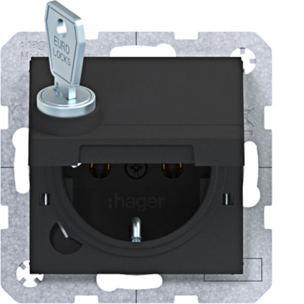 Steckd. SCHUKO m. Klappdeckel, arretierend, Schl., Steckkl., A.x/C.x, n.sw mt