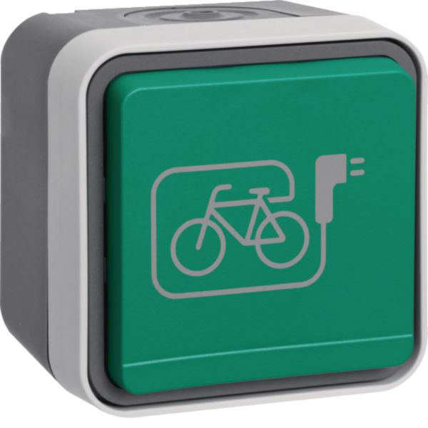 Steckdose m. Schutzkontaktstift AP, grüner Klappd.,Symbol E-Bike, W.1 IP55, grau