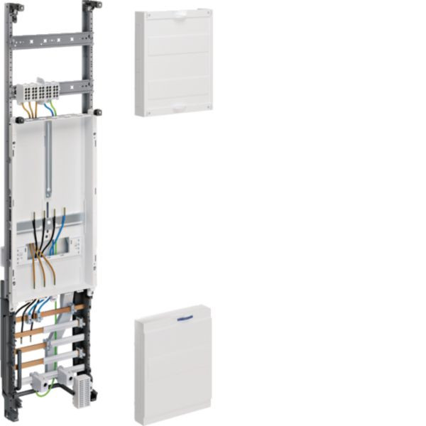 Komplettfeld, univers Z für 3-Punkt-Zählerplätze, konform mit DIN VDE 0603. Ausgestattet für 1 Zählerplatz und 5-polige Hauptleitungsabzweigklemmen. Bietet Schnellmontage durch Rast-System und vorkonfigurierte Verdrahtung gemäß VNB TAB. Anlagenseitiger Anschlussraum mit 2 Hutschienenreihen und fingersicheren Klemmen. Netzseitiger Anschluss mit Kupfer-Sammelschienen, Maße: 12 x 5 Millimeter, 5-polig. Ideal für den Einbau in 1050mm hohe Schränke.
