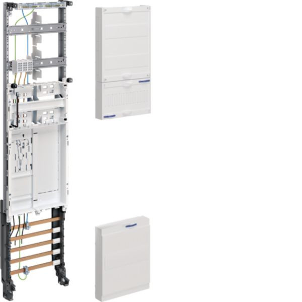 Das 1-feldige Komplettfeld univers Z mit BKE-I, OKK, 1 Zählerplatz, 3-poliger HLAK 16mm² und einer Höhe von 1050mm, ist für den Einbau von elektronischen Haushaltszählern gemäß DIN VDE 0603 konzipiert. Es verfügt über ein Rast-System für schnelle Montage und ist vorkonfektioniert sowie verdrahtet nach VNB TAB. Der Anschlussraum ist 300mm hoch, 2-reihig und mit Hutschienen sowie Hauptleitungsabzweigklemmen ausgestattet. Der Zusatzraum bietet Platz für Kommunikations- und Steuergeräte.