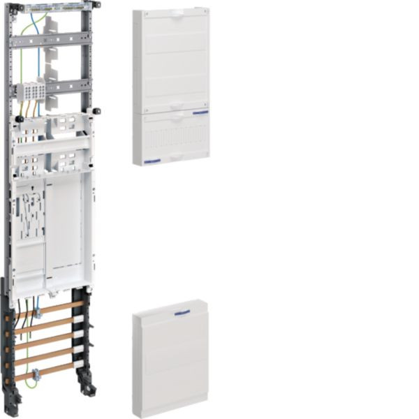 Das Komplettfeld univers Z BKE-I für eHZ-Zählerplätze ist nach DIN VDE 0603 konzipiert und ermöglicht eine schnelle Montage durch das Rast-System. Es ist vormontiert und verdrahtet gemäß VNB TAB. Das Feld bietet ein 1-feldiges Zusatzraum für Kommunikationsgeräte, plombierbar, mit 12 Platzeinheiten auf der Hutschiene und vorbereiteten Öffnungen für Leitungsführungen. Der netzseitige Anschlussraum ist mit Kupfer-Sammelschienen ausgestattet und bietet eine Höhe von 300 mm.