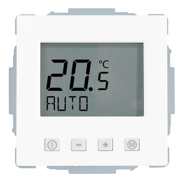 Fußbodenheizungsregler u.P. Komfort, zur Regelung der Fußbodentemperatur unabhängig der Raumtemperatur, mit Zeitschaltuhr, großes, beleuchtetes Display, einschl. Zentralscheibe, ohne Abdeckrahmen, einfache Bedienung, Ist- und Solltemperaturanzeige, 10(4)A, 230V, einschl. Fühler (NTC, 33kOhm bei 25°C) mit 4,00 m Leitung, ohne Fühlerhülse, Umstellmöglichkeit auf Heizen/Kühlen-Funktion und auf Schließerkontakt, selbstlernendes Regelverhalten, Farbe: studioweiß glänzend, ähnlich RAL9016, passend in folgende Schalterprogramme: Busch-Jaeger future, future-linear, solo, axcent, carat, dynasty und pur edelstahl