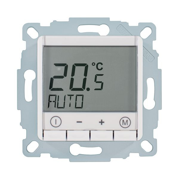 Raumtemperaturregler u.P. Komfort, mit Zeitschaltuhr, großes, beleuchtetes Display, einschl. Zentralscheibe 50x50mm, ohne Abdeckrahmen, einfache Bedienung, Ist- und Solltemperaturanzeige, 10(4)A, 230V, Pumpenschutzfunktion, Umstellmöglichkeit auf Heizen/Kühlen-Funktion und auf Schließerkontakt, für Stellantriebe stromlos geschlossen und stromlos offen, selbstlernendes Regelverhalten, Farbe: reinweiß glänzend, ähnlich RAL9010, passend in nahezu alle Schalterprogramme mittels Zwischenrahmen 50x50mm (nicht im Lieferumfang enthalten)