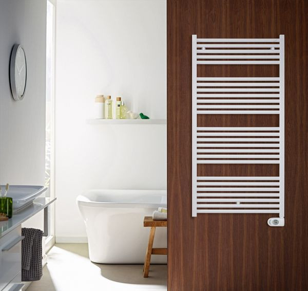 Badheizkörper, 750 W, steckerfertig mit 1,20 m Anschlussleitung, Farbe: weiß (ähnlich RAL9016), Abmessungen 1582x500x95 mm, Schutzklasse II, spritzwassergeschützt, mit integriertem elektronischen Thermostat, mit Displayanzeige, Zeitprogrammierung (Tages- und Wochenprogramme), 2-Stunden-Timerfunktion auf Knopfdruck, mit Funktion für Erkennung offene Fenster, Energieverbrauch im Stand-by-Modus <0,5W, Tastensperre bei Bedarf aktivierbar, der Elektroheizstab ist rechts montiert