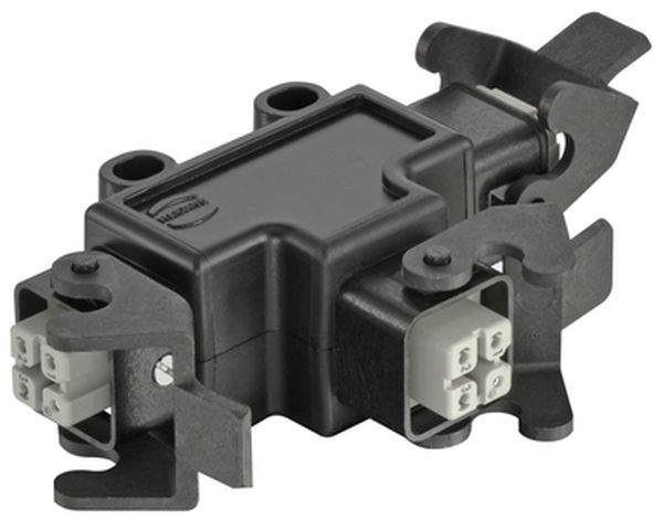 Energieverteiler, mit 3x Han 3 A, im Han 3 A Anbaugehäuse, Kontakte: 3, Werkstoff Gehäuse: Polyamid (PA), RAL 9005 (tiefschwarz), Schutzart: IP44, IP67 mit Dichtschraube 09200009918