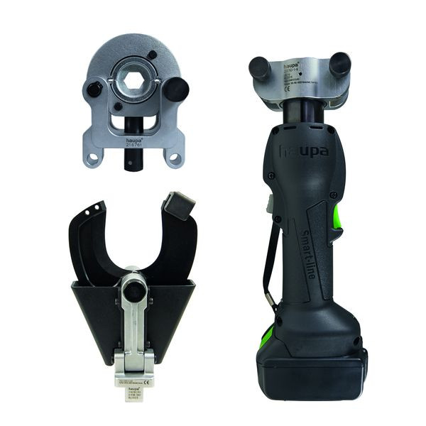 Akkuhydraulik für auswechselbare Schneid-, Stanz- und Pressköpfe, Presskopf 180° drehbar, manueller Rücklauf nach vollendeter Pressung. Set bestehend aus Art. 216760-1, Art. 216761 und Art. 216762/65 in einem SysCon Systemcontainer inkl. Einlage. einfacher Wechsel der Köpfe | arretierbar durch 2 herausziehbare Stifte mit HAUPA Akku Art.-Nr. 215523 und Ladegerät Art.-Nr. 215527 Presskraft kN: 60 | Arbeitsdruck in bar: 700