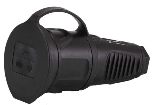 Schutzkontakt-Kupplung 250 V / 16 A, Typ Fin der Gummi-Ausführung mit Deckel in schwarz, Schutzart IP54.Ausgelegt ist die Kupplung für Leitungen mit einem Querschnitt von maximal 3x2,5 mm².