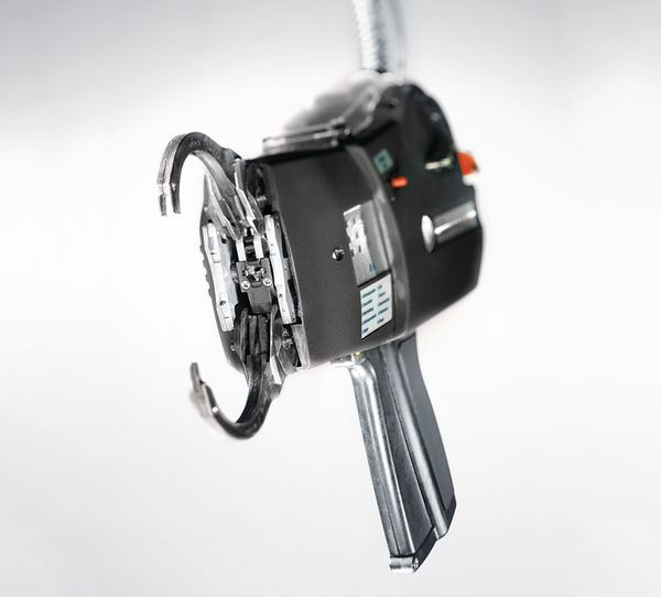 Elektrisch betriebenes Bündelsystem. Einsatz in Hänge- oder Montagevorrichtung 3080 möglich. Integration in vollautomatisierte Fertigungsanlagen möglich. Zangen in drei verschiedenen Durchmessern - 30,50 und 80 mm - im Lieferumfang enthalten. Qualitativ hochwertiges, abfallfreies Bündeln und Schneiden bis Ø 80 mm. Hohe Mindestschlaufenhaltekraft der Bündelung. Bündeldurchmesser wird mechanisch erkannt. Außenverzahntes Bandmaterial aus Polyamid 66. Abfallfreie Bündelung ohne Bandüberstand. Kurze Zykluszeit ca. 1,3 Sekunden, je nach Bündeldurchmesser. Fußteilbündelung mit speziellen Bündelzangen möglich. Das Autotool System 3080 ist ein automatisches und elektrisches Bündelungssystem, welches entwickelt wurde, um Abbindeprozesse zu beschleunigen und abfallfrei zu arbeiten. Durch drei schnell wechselbare Zangengrößen lässt sich das Autotool System 3080 optimal auf verschiedene Bündeldurchmesser bis 80 mm anpassen. Mit der Montagevorrichtung 3080 oder der Hängevorrichtung 3080 ist das Autotool System 3080 sowohl für den stationären als auch für den flexiblen Einsatz geeignet. Durch spezielle Vorrichtungen kann das Autotool System 3080 zusätzlich auch in vollautomatisierte Fertigungsanlagen integriert werden.Anbündelung von Fußteilen kann durch speziell entwickelte Bündelzangen in einer vollautomatisierten Fertigungsanlage durchgeführt werden.
